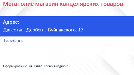 Мегаполис, магазин канцелярских товаров по адресу Дагестан, Дербент, Буйнакского, 17 в дальнейшем Организация, размещена в следующих категориях: