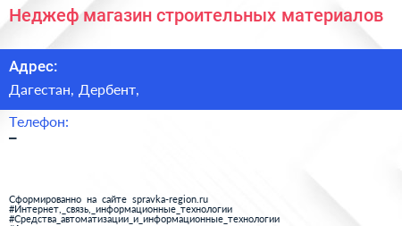 Неджеф, магазин строительных материалов по адресу Дагестан, Дербент, в дальнейшем Организация, размещена в следующих категориях: