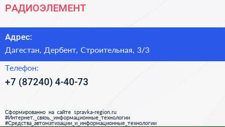 РАДИОЭЛЕМЕНТ по адресу Дагестан, Дербент, Строительная, 3/3 в дальнейшем Организация, размещена в следующих категориях: