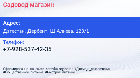 Садовод, магазин по адресу Дагестан, Дербент, Ш.Алиева, 123/1 в дальнейшем Организация, размещена в следующих категориях: