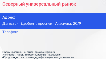 Северный, универсальный рынок по адресу Дагестан, Дербент, проспект Агасиева, 20/9 в дальнейшем Организация, размещена в следующих категориях: