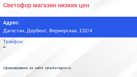 Светофор, магазин низких цен по адресу Дагестан, Дербент, Фермерская, 132/4 в дальнейшем Организация, размещена в следующих категориях: