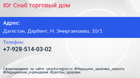 Юг-Снаб, торговый дом по адресу Дагестан, Дербент, Н. Эмиргамзаева, 10/1 в дальнейшем Организация, размещена в следующих категориях: