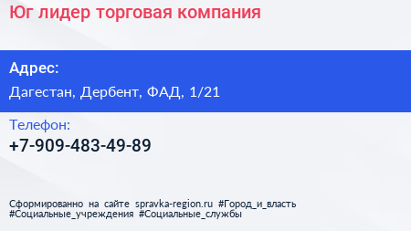 Юг-лидер, торговая компания по адресу Дагестан, Дербент, ФАД, 1/21 в дальнейшем Организация, размещена в следующих категориях: