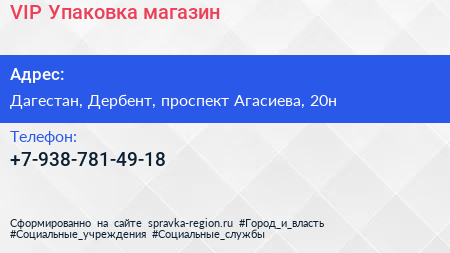 VIP-Упаковка, магазин по адресу Дагестан, Дербент, проспект Агасиева, 20н в дальнейшем Организация, размещена в следующих категориях: