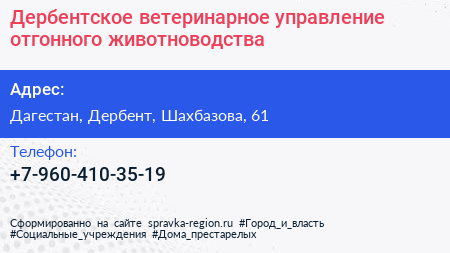 Дербентское ветеринарное управление отгонного животноводства по адресу Дагестан, Дербент, Шахбазова, 61 в дальнейшем Организация, размещена в следующих категориях: