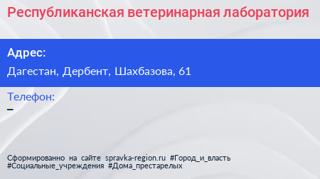 Республиканская ветеринарная лаборатория по адресу Дагестан, Дербент, Шахбазова, 61 в дальнейшем Организация, размещена в следующих категориях: