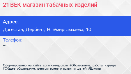 21 ВЕК, магазин табачных изделий по адресу Дагестан, Дербент, Н. Эмиргамзаева, 10 в дальнейшем Организация, размещена в следующих категориях: