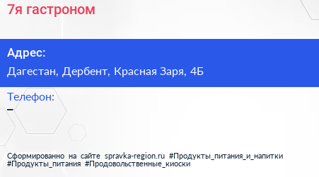 7я, гастроном по адресу Дагестан, Дербент, Красная Заря, 4Б в дальнейшем Организация, размещена в следующих категориях:
