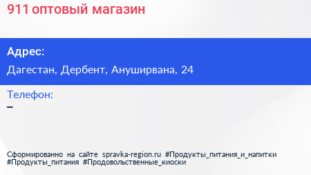 911, оптовый магазин по адресу Дагестан, Дербент, Ануширвана, 24 в дальнейшем Организация, размещена в следующих категориях: