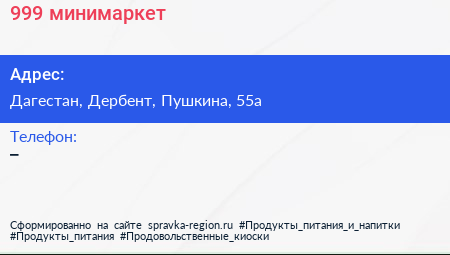 999, минимаркет по адресу Дагестан, Дербент, Пушкина, 55а в дальнейшем Организация, размещена в следующих категориях:
