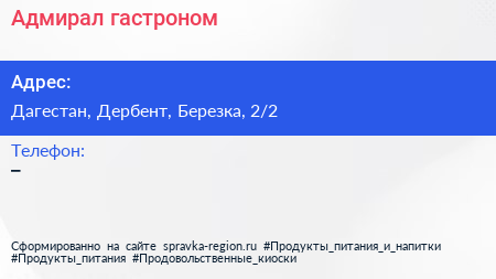 Адмирал, гастроном по адресу Дагестан, Дербент, Березка, 2/2 в дальнейшем Организация, размещена в следующих категориях: