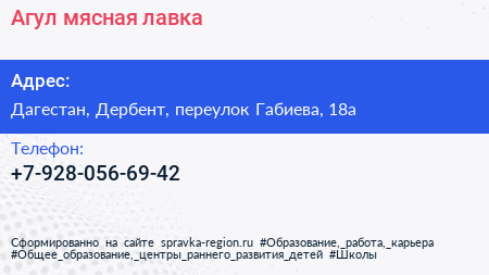 Агул, мясная лавка по адресу Дагестан, Дербент, переулок Габиева, 18а в дальнейшем Организация, размещена в следующих категориях: