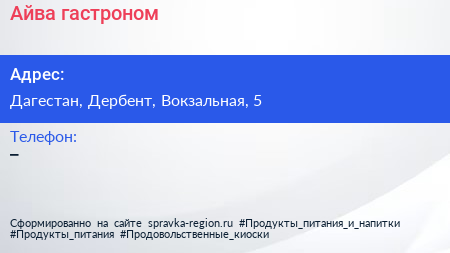 Айва, гастроном по адресу Дагестан, Дербент, Вокзальная, 5 в дальнейшем Организация, размещена в следующих категориях: