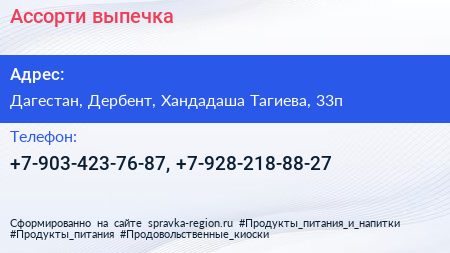 Ассорти, выпечка по адресу Дагестан, Дербент, Хандадаша Тагиева, 33п в дальнейшем Организация, размещена в следующих категориях: