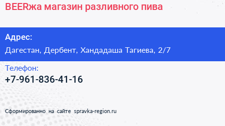 BEERжа, магазин разливного пива по адресу Дагестан, Дербент, Хандадаша Тагиева, 2/7 в дальнейшем Организация, размещена в следующих категориях: