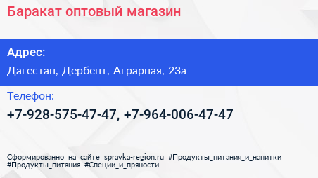Баракат, оптовый магазин по адресу Дагестан, Дербент, Аграрная, 23а в дальнейшем Организация, размещена в следующих категориях: