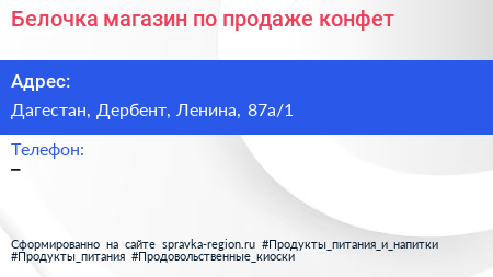 Белочка, магазин по продаже конфет по адресу Дагестан, Дербент, Ленина, 87а/1 в дальнейшем Организация, размещена в следующих категориях: