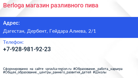 Berloga, магазин разливного пива по адресу Дагестан, Дербент, Гейдара Алиева, 2/1 в дальнейшем Организация, размещена в следующих категориях: