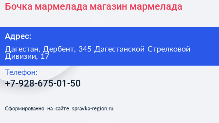 Бочка мармелада, магазин мармелада по адресу Дагестан, Дербент, 345 Дагестанской Стрелковой Дивизии, 17 в дальнейшем Организация, размещена в следующих категориях: