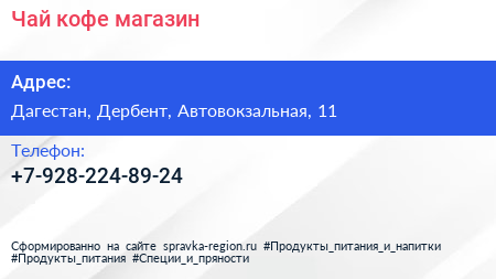 Чай кофе, магазин по адресу Дагестан, Дербент, Автовокзальная, 11 в дальнейшем Организация, размещена в следующих категориях: