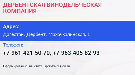 ДЕРБЕНТСКАЯ ВИНОДЕЛЬЧЕСКАЯ КОМПАНИЯ по адресу Дагестан, Дербент, Махачкалинская, 1 в дальнейшем Организация, размещена в следующих категориях: