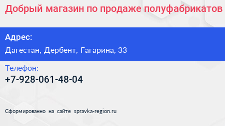 Добрый, магазин по продаже полуфабрикатов по адресу Дагестан, Дербент, Гагарина, 33 в дальнейшем Организация, размещена в следующих категориях: