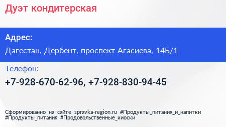 Дуэт, кондитерская по адресу Дагестан, Дербент, проспект Агасиева, 14Б/1 в дальнейшем Организация, размещена в следующих категориях: