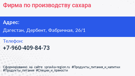 Фирма по производству сахара по адресу Дагестан, Дербент, Фабричная, 26/1 в дальнейшем Организация, размещена в следующих категориях: