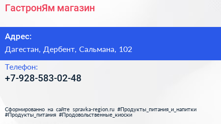 ГастронЯм, магазин по адресу Дагестан, Дербент, Сальмана, 102 в дальнейшем Организация, размещена в следующих категориях: