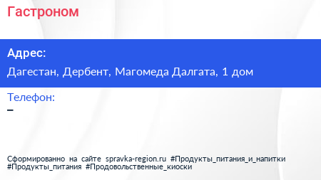 Гастроном по адресу Дагестан, Дербент, Магомеда Далгата, 1 дом в дальнейшем Организация, размещена в следующих категориях: