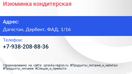 Изюминка, кондитерская по адресу Дагестан, Дербент, ФАД, 1/16 в дальнейшем Организация, размещена в следующих категориях: