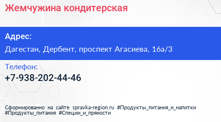 Жемчужина, кондитерская по адресу Дагестан, Дербент, проспект Агасиева, 16а/3 в дальнейшем Организация, размещена в следующих категориях: