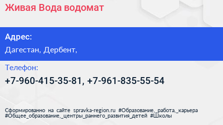 Живая Вода, водомат по адресу Дагестан, Дербент, в дальнейшем Организация, размещена в следующих категориях: