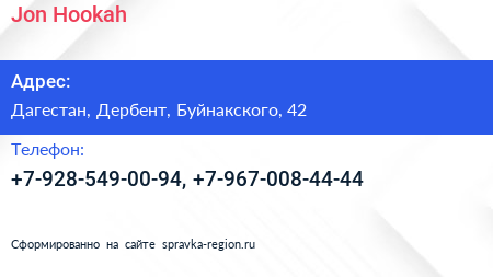 Jon Hookah по адресу Дагестан, Дербент, Буйнакского, 42 в дальнейшем Организация, размещена в следующих категориях:
