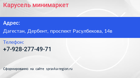 Карусель, минимаркет по адресу Дагестан, Дербент, проспект Расулбекова, 14в в дальнейшем Организация, размещена в следующих категориях: