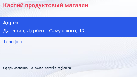 Каспий, продуктовый магазин по адресу Дагестан, Дербент, Самурского, 43 в дальнейшем Организация, размещена в следующих категориях: