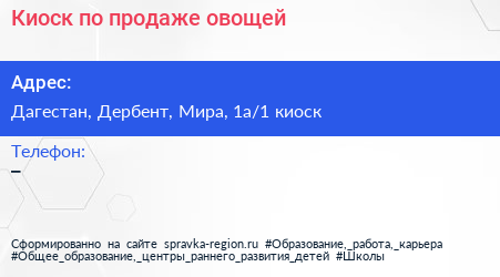Киоск по продаже овощей по адресу Дагестан, Дербент, Мира, 1а/1 киоск в дальнейшем Организация, размещена в следующих категориях: