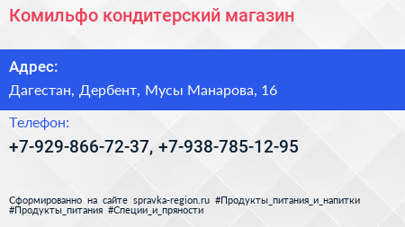 Комильфо, кондитерский магазин по адресу Дагестан, Дербент, Мусы Манарова, 16 в дальнейшем Организация, размещена в следующих категориях: