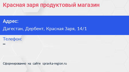 Красная заря, продуктовый магазин по адресу Дагестан, Дербент, Красная Заря, 14/1 в дальнейшем Организация, размещена в следующих категориях: