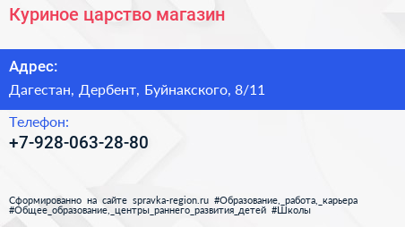 Куриное царство, магазин по адресу Дагестан, Дербент, Буйнакского, 8/11 в дальнейшем Организация, размещена в следующих категориях: