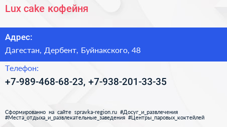 Lux cake, кофейня по адресу Дагестан, Дербент, Буйнакского, 48 в дальнейшем Организация, размещена в следующих категориях: