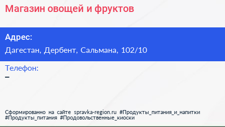 Магазин овощей и фруктов по адресу Дагестан, Дербент, Сальмана, 102/10 в дальнейшем Организация, размещена в следующих категориях: