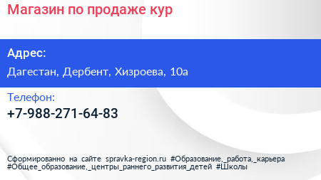Магазин по продаже кур по адресу Дагестан, Дербент, Хизроева, 10а в дальнейшем Организация, размещена в следующих категориях:
