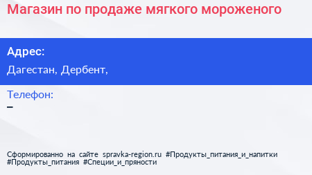 Магазин по продаже мягкого мороженого по адресу Дагестан, Дербент, в дальнейшем Организация, размещена в следующих категориях: