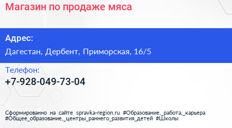 Магазин по продаже мяса по адресу Дагестан, Дербент, Приморская, 16/5 в дальнейшем Организация, размещена в следующих категориях: