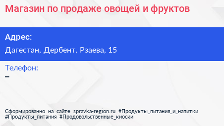 Магазин по продаже овощей и фруктов по адресу Дагестан, Дербент, Рзаева, 15 в дальнейшем Организация, размещена в следующих категориях: