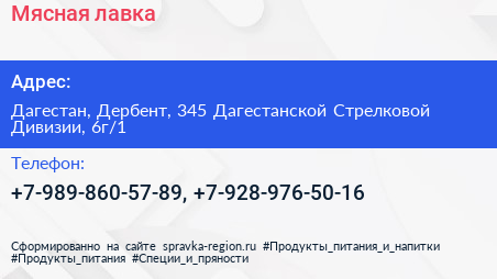 Мясная лавка по адресу Дагестан, Дербент, 345 Дагестанской Стрелковой Дивизии, 6г/1 в дальнейшем Организация, размещена в следующих категориях:
