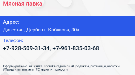 Мясная лавка по адресу Дагестан, Дербент, Кобякова, 30а в дальнейшем Организация, размещена в следующих категориях: