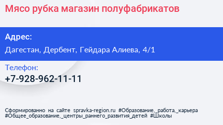 Мясо.рубка, магазин полуфабрикатов по адресу Дагестан, Дербент, Гейдара Алиева, 4/1 в дальнейшем Организация, размещена в следующих категориях: